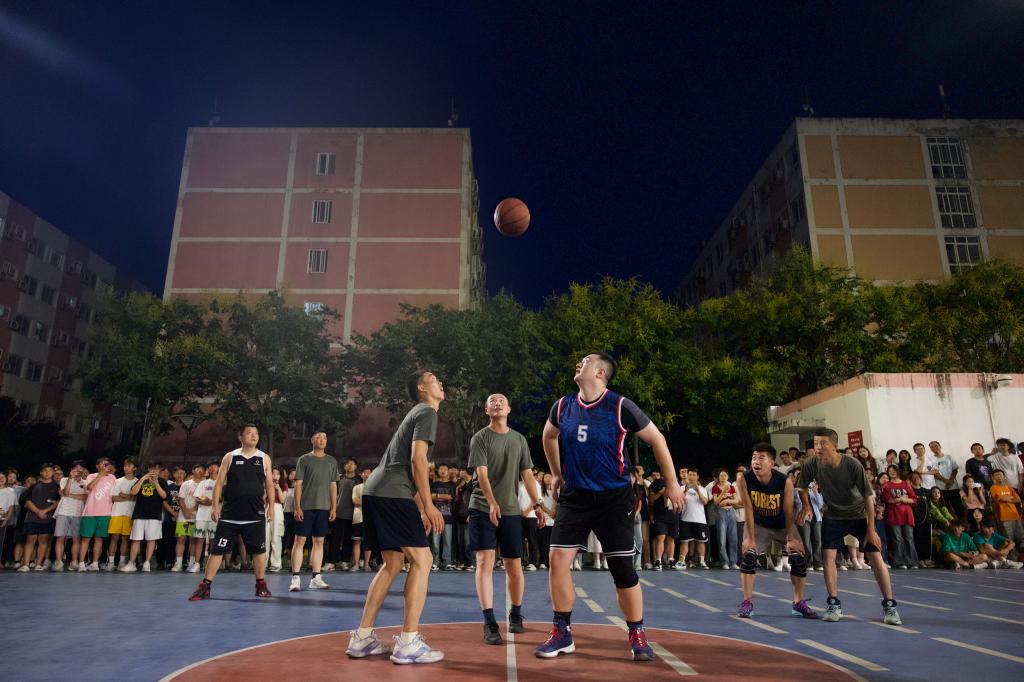 发球、运球、传球、断球、拼抢……球场内,老师和教官展开了激烈的争夺,快攻猛打,气氛紧张热烈;球场外,欢呼声、呐喊声不绝于耳。速度与激情在篮球场上碰撞,身体与意志不断较量,球员们你争我夺、你攻我守,场面激烈,扣人心弦,比赛一次又一次涌向高潮。