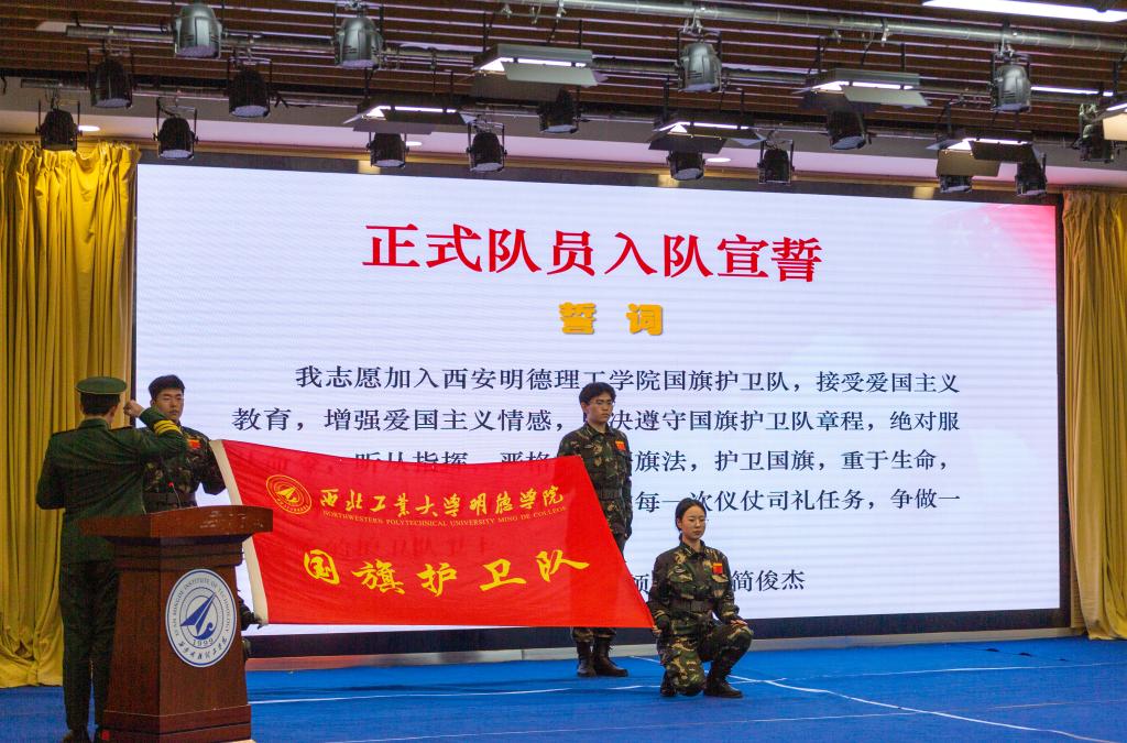 紧接着,校团委刘雄副书记宣布任命第二十三届国旗护卫队队长名单,并与李传斌老师共同为新任队长颁发了聘书;校团委乔建副书记宣布任命新一届国旗护卫队部长名单,并与学生工作部唐松轩老师共同为新任部长颁发了聘书;新老队长进行了授刀仪式;新任队长焦智昱宣读了入队正式队员名单并代表第二十三届国旗护卫队作了发言;刘雄副书记、李传斌老师为正式队员代表授衔;新一届全体队员做了入队宣誓,正式队员任勇杰作了表态发言。