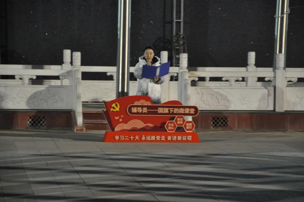 升旗仪式结束后,高等职业技术学院卫莹涛老师站在国旗下进行了主题为“一方有难八方支援,守望相助共克时艰”的微课堂。她在微课中讲到,回望昔日洪水滔滔,我们胼手胝足共释水患;汶川之震,我们携手并肩重建家园;新冠肆虐,我们众志成城抗击疫情。多难兴邦,中华民族历经沧桑饱受岁月洗礼而生生不息,靠的是“岂曰无衣,与子同袍”的华夏民族精神,靠的是亿万中华儿女爱国之心汇聚而成的中国力量,靠的是中国共产党坚强正确的领导。12月18日午夜,甘肃临夏州积石山县发生6.2级地震,生死攸关之际,灾情就是命令,各方救援力量闻令而动,一张张坚毅的面孔,传递着党的声音,一双双温暖的双手,凝聚着党的力量,我们又一次看到了一方有难八方支援的感人场景,又一次看到守望相助共克时艰的家国情怀。她最后号召同学们,要厚植爱国情怀,敢于担当,乐于奉献,永远听党话,跟党走,为中华民族伟大复兴奉献自己的青春和力量。