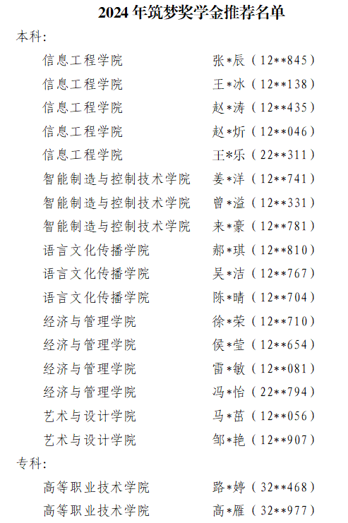 根据陕西省教育厅办公室《关于开展2024年度筑梦奖学金项目的通知》陕教办〔2024〕30号文件要求,本着公开、公正、公平、择优的原则,经学生申请、学院初审、最终确定2024年筑梦奖学金提名名单,现予以公示: