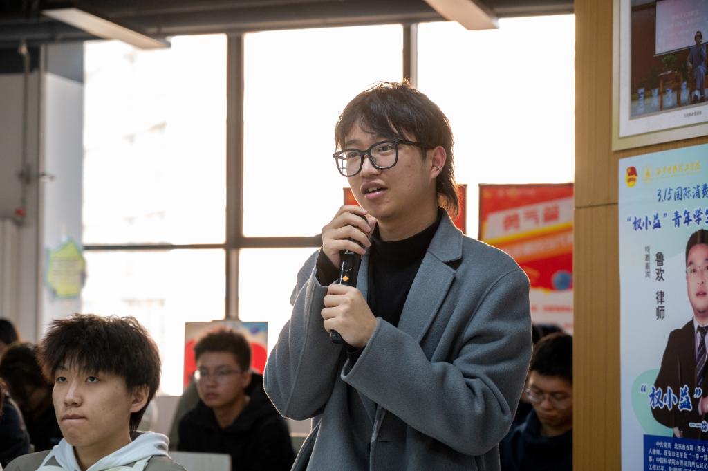 互动破冰从生活痛点切入法律活动以“有问必答”趣味互动开场,鲁欢律师抛出问题:“你是否遇到过消费憋屈事?如何处理?”学生纷纷分享网购纠纷、霸王条款等经历。结合《中华人民共和国消费者权益保护法》,鲁律师引导学生聚焦知情权、选择权、公平交易权等核心权益,强调“法律是解决问题的第一工具”。