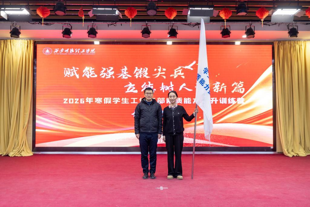 人力资源处副处长康抗为训练营授旗,训练营班主任花芸接旗。旗帜象征着责任与使命,也标志着本次寒假训练营正式启动,为全体参训人员注入了奋进动力。
