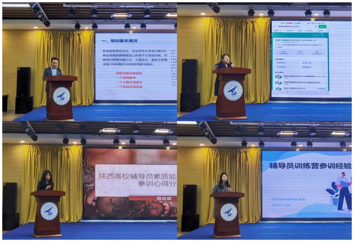 辅导员专题研讨沙龙环节,由智能制造与控制技术学院党委副书记曾凯和高等职业技术学院王会霞两位老师,结合外出参加的“第405期全国高校思想政治工作骨干示范培训”及“陕西省心理健康教育培训”课程内容作分享。经济与管理学院周佳琪和语言文化传播学院侯澄两位老师就参加陕西高校辅导员素质能力提升训练营作参训经历分享。