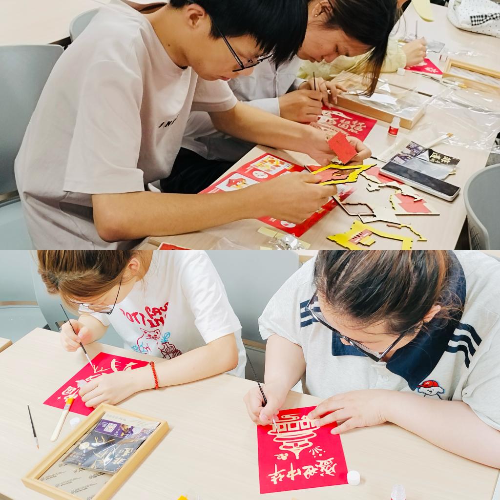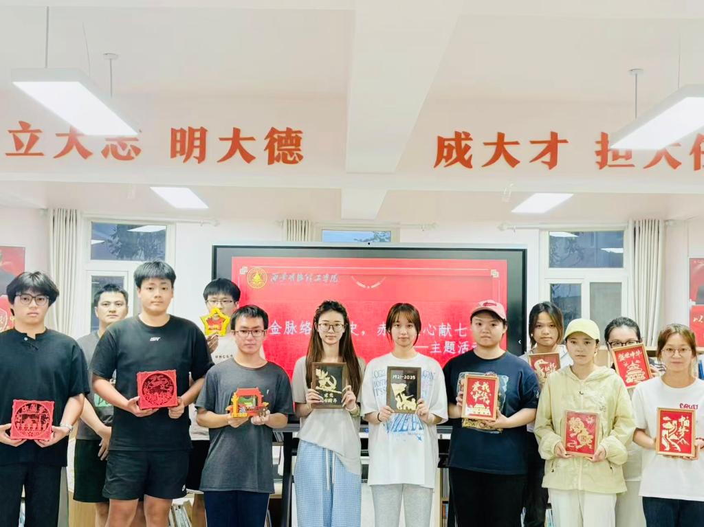 活动将理论学习与沉浸式体验相结合。与会同学集中学习了伟大建党精神的科学内涵,通过导学与研讨,大家共同重温红船精神、井冈山精神、长征精神、延安精神等精神谱系内容,领悟其时代内涵,筑牢思想根基。在沉浸式手工实践环节,同学们分组开展“匠心工坊”,通过亲手制作金箔画、立体剪纸和拼接摆件,将对党的深情厚谊融入指尖艺术。金箔画制作中,大家精心设计图案,小心翼翼覆盖金箔,创作出熠熠生辉的党徽主题作品;立体剪纸环节,巧手翻飞、红纸生辉,细心描摹裁剪出党徽、红船、天安门等立体生动的图案。一刀一刻的精工细作,既是对传统技艺的体验,更是对新时代“匠心”精神的生动诠释。活动中,同学们热情高涨,团结协作,共同完成了富有创意的作品。