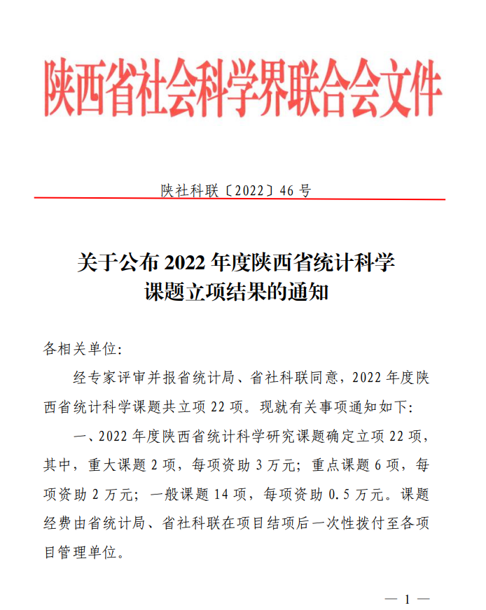 陕西省统计科学课题为陕西省社科界重大理论与现实问题研究项目,由省社科联、省统计局组织实施,面向全省公开申报,今年陕西省统计科学课题共立项22项,beat365第一次组织申报,我院教师积极申报,并成功立项。