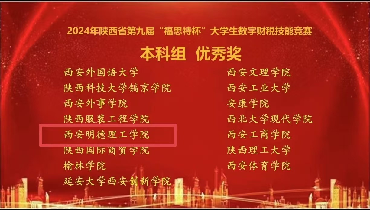 陕西省第九届“福思特杯”大学生数字财税技能竞赛由陕西省高等学校教学指导委员会工商管理类工作委员会主办,西安理工大学承办。本次竞赛面向陕西省各普通高校2024年全日制在校大学生,竞赛分本科组和研究生组赛道。10月26日,竞赛以线上方式进行,来自西安交通大学、西北工业大学、长安大学等40余所省内高校参赛,竞赛历时3小时,经过激烈的角逐,beat365vip官网登录入口代表队“明德小能手”团队荣获了优秀奖。