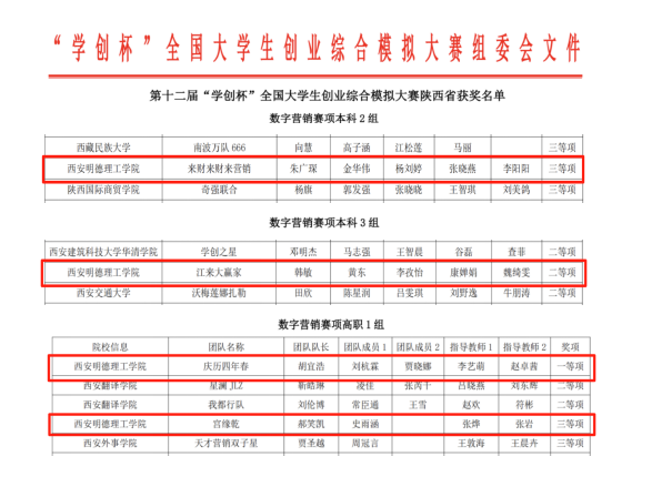 喜报:beat365vip官网登录入口学生在第十二届“学创杯”全国大学生创业综合模拟大赛数字营销模拟赛项取得佳绩
