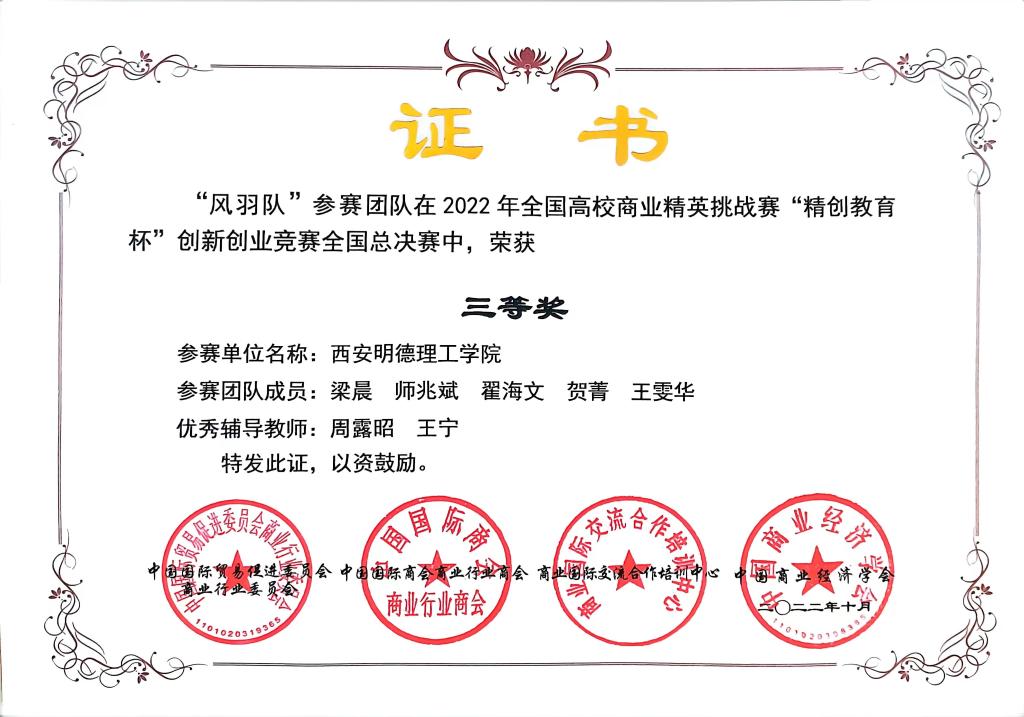 由周露昭,王宁老师指导,梁晨等同学参与的“风羽队”荣获本科组国家三等奖。