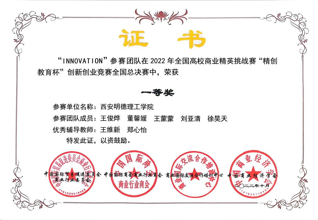 在本次比赛中,团队成员积极备赛,指导老师悉心指导。由王维新,郑心怡老师指导,王俊烨等同学参与的“INNOVATION队”荣获本科组国家一等奖。