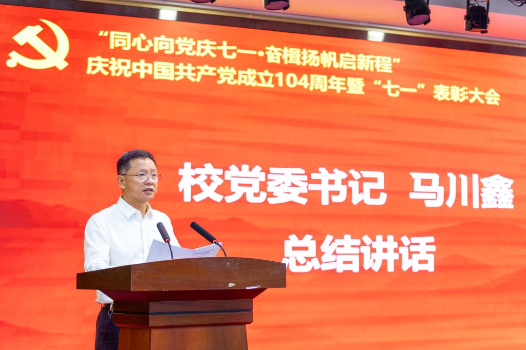 校党委书记马川鑫在讲话中回顾了中国共产党104年的光辉历程,总结了近年来学校党委落实立德树人根本任务、聚焦中心工作取得的成绩,指出了当前工作的重心和重点,同时代表学校党委向新党员同志表示热烈的欢迎,向受到表彰的先进集体和优秀个人表示热烈的祝贺,向全校共产党员致以节日的问候。号召各级党组织和广大党员干部不忘初心、牢记使命,见贤思齐、砥砺前行,为学校高质量发展作出更大贡献。