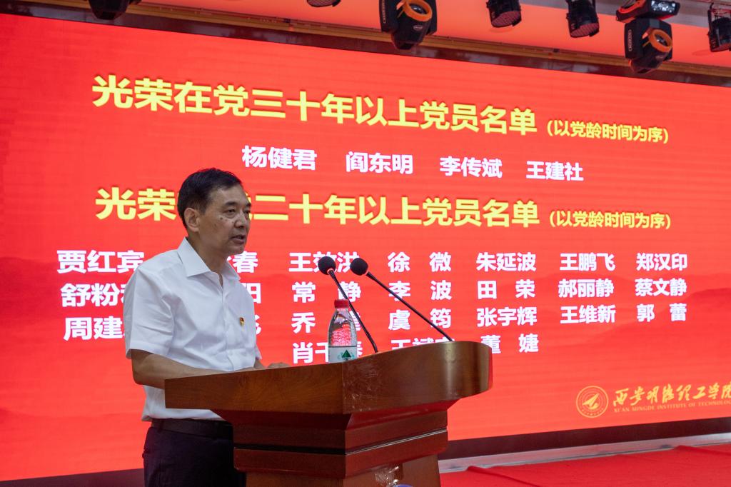 阎东明代表学校党委向新发展党员同志表示热烈的祝贺,向光荣在党二十年以上的党员同志表示诚挚的敬意,向全校党员师生致以节日的问候。他简要回顾了党一路走来的光辉历程和伟大成就,对学校转型发展面临的形势和任务进行了客观的分析,对各基层党委(党总支)、各党支部、全体党员在学校转型发展中如何发挥作用提出了明确要求。各基层党委(党总支)要成为宣传党的主张、贯彻党的决定、领导基层治理、团结动员群众、推动改革发展的坚强战斗堡垒,瞄准本科教学工作合格评估、落实“十四五”教育事业发展规划等关键点开展党建工作,推动党建与业务工作有效融合。各党支部要以提升组织力为重点,切实担负起教育党员、管理党员、监督党员和组织群众、宣传群众、凝聚群众、服务群众职责,通过扎实的思想工作引导广大党员在事业发展中起到先锋模范作用,影响和带领群众积极投身到学校转型发展的实践中去。广大党员要时刻牢记共产党员第一身份,勇于担当,率先垂范,在急难险重任务时站得出来,在学校改革发展中走在前列,充分发挥先锋模范作用,让党的旗帜始终高高飘扬。各级党组织和广大党员要坚持目标同向、思想同心、行动同力,锐意进取,埋头苦干,加快推进学校高质量转型发展,以更昂扬的姿态、更扎实的工作、更优异的成绩迎接党的二十大胜利召开!