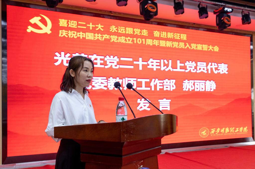 光荣在党二十年以上党员代表、党委教师工作部郝丽静结合学校发展历程与个人成长经历,分享了一路走来的感动与收获,表示要做信念坚定的追梦人,在平凡的岗位上继续书写人生华章。预备党员代表、经济与管理学院学生句宇坤在发言中表示,作为学生党员,要树立标杆意识,学习过硬本领,勇担时代责任和历史使命,在实现第二个百年奋斗目标中贡献青春力量。