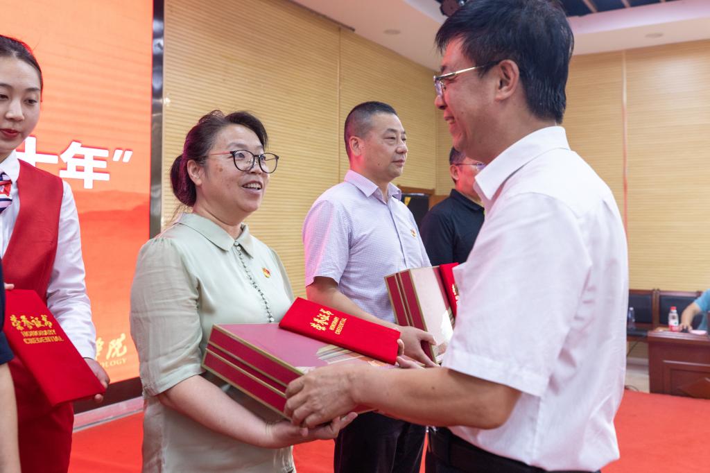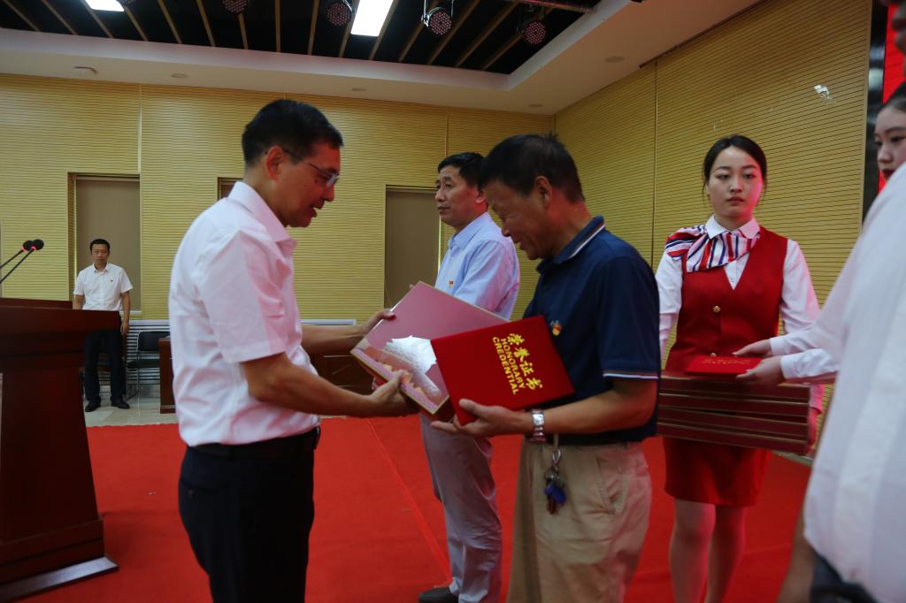 学校党委书记阎东明,党委副书记、校长杨健君为光荣在党二十年以上的党员代表颁发荣誉证书和政治生日纪念品。