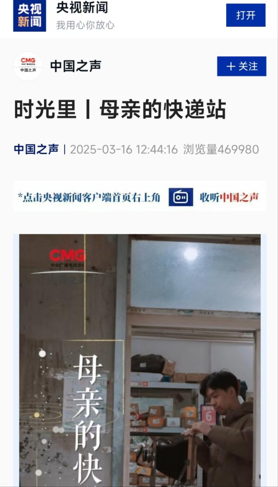 央视新闻客户端中国之声栏目-《母亲的快递站》