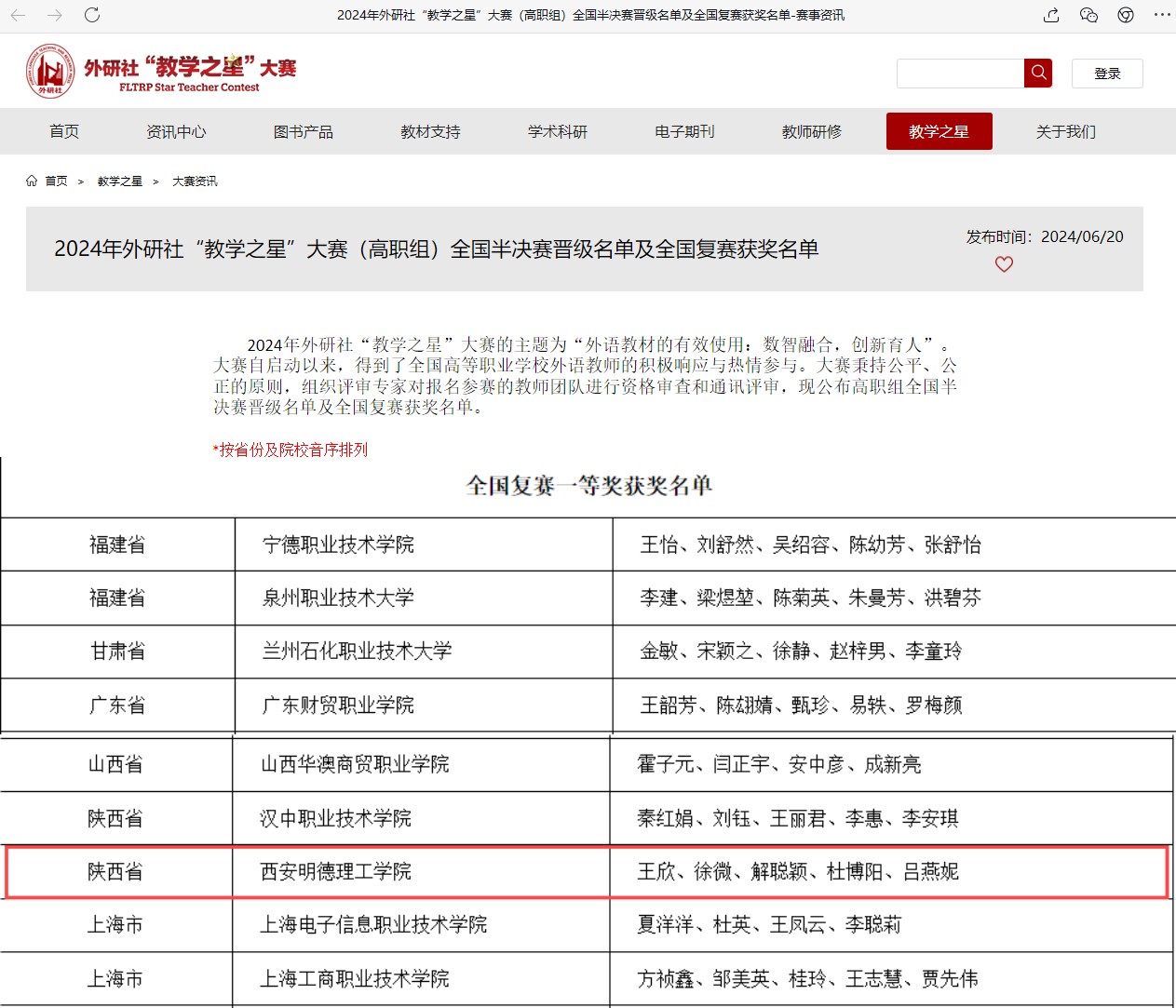 6月20日,2024年“教学之星”大赛全国复赛获奖名单正式公布。语言文化传播学院选拔推荐的五位教师——王欣、徐微、解聪颖、杜博阳和吕燕妮组成的高职组比赛团队,以其卓越的教学能力和独特的教学方式,荣获全国复赛一等奖。