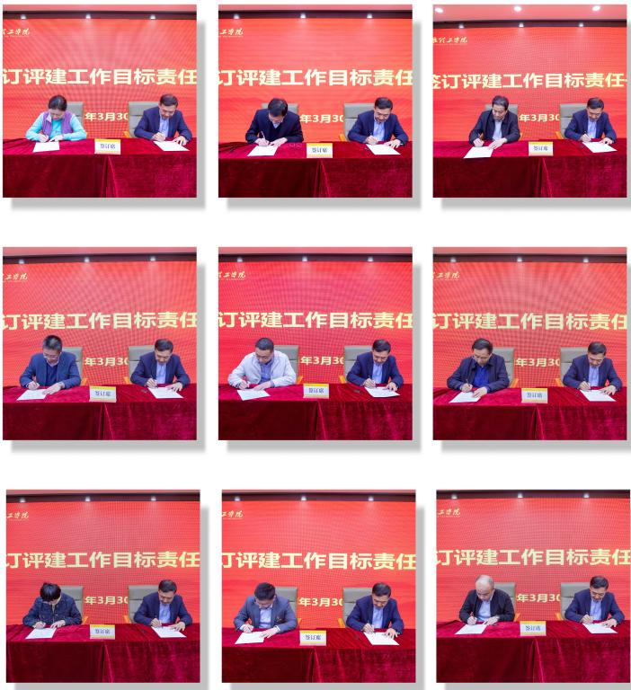 会上,校长杨健君分别与二级学院、职能部门代表签订评建工作目标责任书。校长杨健君在讲话中强调,要认真贯彻“以评促建,以评促改,以评促管,评建结合,重在建设”的方针,深刻理解把握“四个促进、三个基本、两个突出、一个引导”的内涵要求;要坚持问题导向,梳理问题,制定整改方案,精准评建;要准确把握指标体系的内涵要求,对标建设,对表实施;要健全评建工作机制;要落实评建工作奖惩制度;要加强宣传教育,形成人人了解评估,人人参与评估的氛围;要围绕大局,统筹协调,举全校之力,共克时艰,压实责任,扎实推进评建工作。