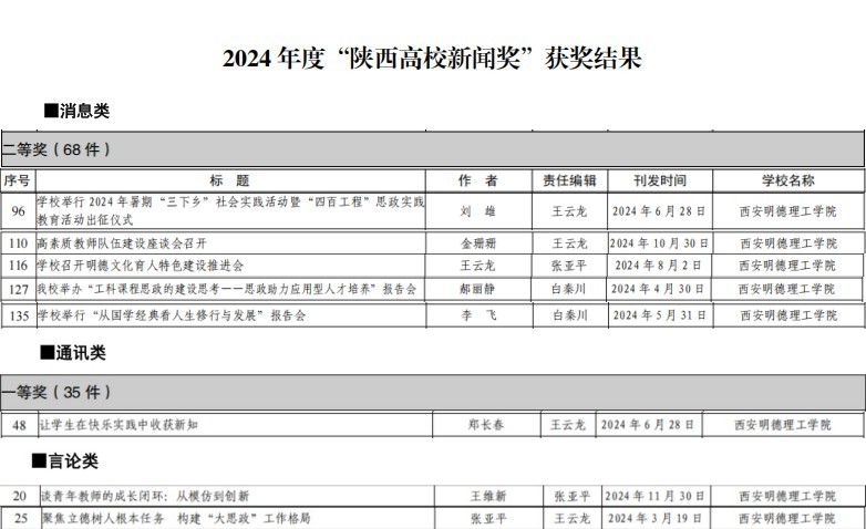 由郑长春撰写的《让学生在快乐实践中收获新知》获通讯类作品一等奖;由刘雄撰写的《学校举行2024年暑期“三下乡”社会实践活动暨“四百工程”思政实践教育活动出征仪式》、金珊珊撰写的《高素质教师队伍建设座谈会召开》、王云龙撰写的《学校召开明德文化育人特色建设推进会》、郝丽静撰写的《beat365举办“工科课程思政的建设思考--思政助力应用型人才培养”报告会》、李飞撰写的《学校举行“从国学经典看人生修行与发展”报告会》获消息类作品二等奖,王维新撰写的《谈青年教师的成长闭环:从模仿到创新》、张亚平撰写的《聚焦立德树人根本任务 构建“大思政”工作格局》获言论类作品二等奖。