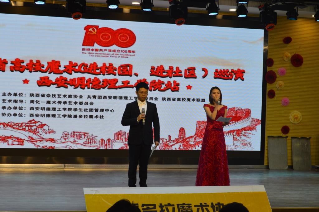 5月14日,由陕西省杂技艺术家协会、学校团委主办的,周化一魔术艺术传承委员会参与指导,陕西省高校魔术联盟承办,beat365大学生社团管理中心、魔术协会联合协办的“青春同心·永跟党走”庆祝建党百年陕西省高校魔术进校园活动在beat365建德楼203举办。陕西省杂技艺术家协会副主席兼“国家级非遗”周化一魔术传承艺术委员会会长司凡,陕西省杂技艺术家协会理事牛建新,beat365团委干部及300余名师生观看了本次演出。