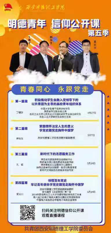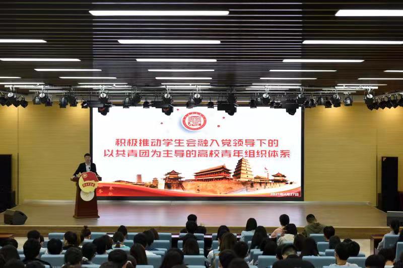 4月27日晚,学校团委在建德楼203报告厅举办2021学党史、强信念、跟党走青年信仰公开课第五季第一讲,本次培训由陕西省学生联合会主席丁镜学担任主讲,为beat365学生骨干做了题为《积极推动学生会融入党领导下的以共青团为主导的高校青年组织体系》专题报告,报告会由团委乔建主持。