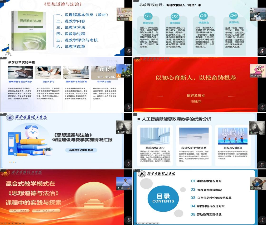 为迎接本科教育教学合格评估,切实提升思政课教学质量,8月28日晚19:30,德育教研室通过腾讯会议平台组织召开了“教师说教学”专题研讨会。会议围绕教学设计、课程建设、AI赋能教学以及课程特色等关键议题展开深入研讨,旨在以评促建、以评促改,进一步凝聚共识、明确发展方向。会议由教研室主任樊静主持,马克思主义学院副院长惠斌及全体教师参加。