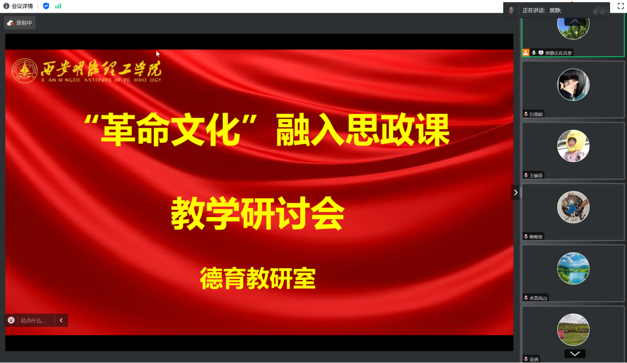 7月23日晚上,德育教研室通过腾讯会议召开“革命文化”融入思政课教学专题研讨会,深入学习贯彻习近平总书记关于思政课建设的重要指示精神,落实陕西省革命文化融入“大思政课”建设工作部署。会议由德育教研室主任樊静主持,马克思主义学院副院长惠斌及教研室全体教师在线参会并展开深入交流。