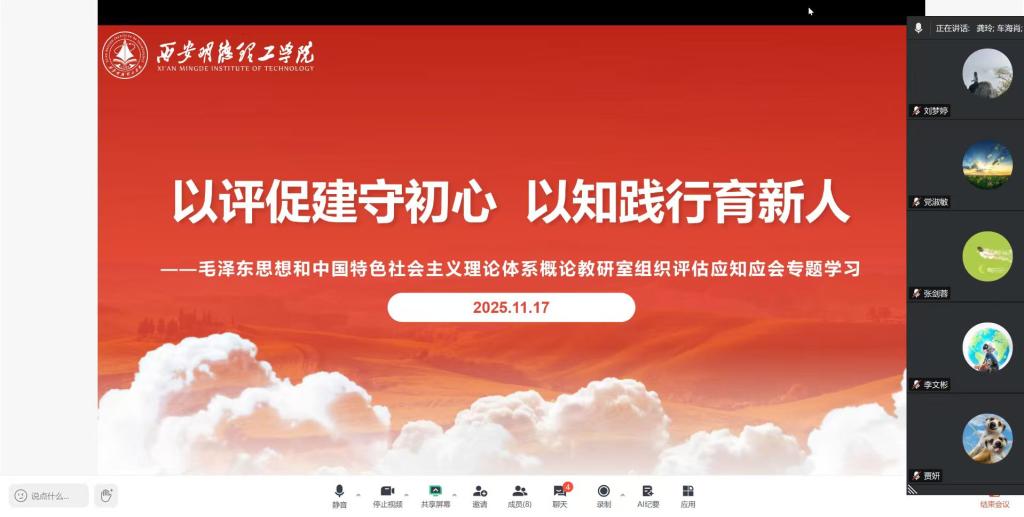 为深入贯彻落实教育部关于本科教学工作合格评估的指示精神,2025年11月17日晚20点,毛泽东思想和中国特色社会主义理论体系概论教研室通过线上会议形式组织召开了评估应知应会专题学习会。会议由教研室主任龚玲主持,教研室全体教师参会,旨在统一思想、深化认识、凝聚力量,将评建工作落到实处。