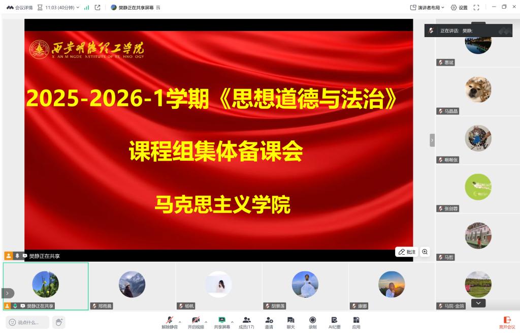 为深入贯彻落实党的二十届四中全会精神,进一步加强和改进新时代高校思想政治理论课教学,提升课程育人实效,10月26日晚上19:30,马克思主义学院《思想道德与法治》课程组全体教师在线上参加了集体备课会,会议由德育教研室主任樊静主持,本次备课会聚焦课程建设与发展,重点围绕教材第三章、第四章教学内容进行了深入研讨和交流。