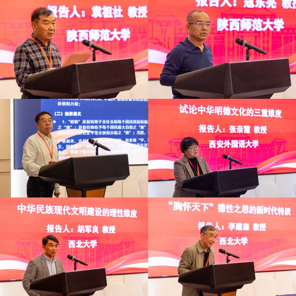主旨发言第三阶段由西北大学李建森教授主持,陕西师范大学袁祖社教授以《“君子风范”与“公民人格”:中国传统德性伦理的现代性转化》为题、陕西师范大学寇东亮教授以《新时代道德建设的话语及其结构》为题,三亚学院媱轩鸽教授以《“明明德”对新一轮财税改革的主要启示初探——兼议当前面临的挑战与对策》为题、西安外国语大学张亲霞教授以《试论中华明德文化的三重维度》为题、西北大学胡军良教授以《中华民族现代文明建设的理性维度》为题分别作主旨报告。