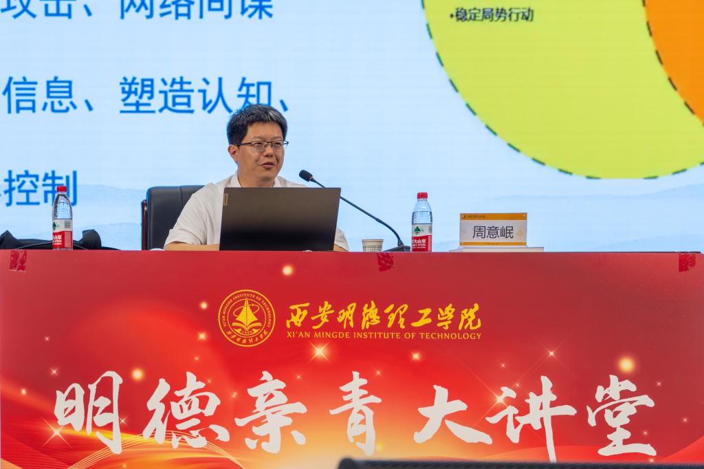 5月14日下午,beat365vip官网登录入口第五十三期“明德亲青大讲堂”在四季廊桥报告厅开讲。本期讲堂以“智能化时代的国际安全范式”为主题,特邀西安工业大学马克思主义学院马克思主义基本原理教研部主任、硕士生导师周意岷副教授担任主讲。马克思主义学院党委书记王君涛、副院长惠斌及全体教师、全校千余名学生共同参与,本次报告由惠斌副院长主持。
