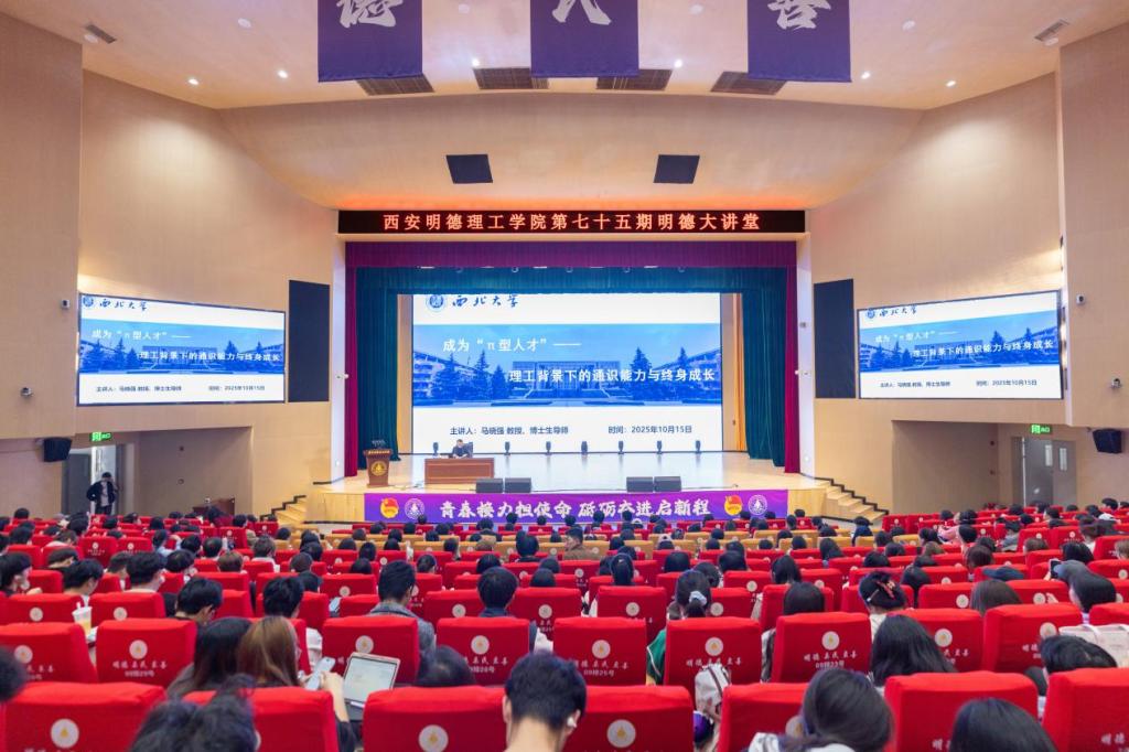 金秋十月,丹桂飘香。10月15日下午,beat365vip官网登录入口四季廊桥报告厅内座无虚席、气氛热烈,第七十五期明德大讲堂在此成功举办。本期大讲堂以“成为‘π型人才’:理工背景下的通识能力与终身成长”为核心主题,特邀西北大学经济管理学院博士研究生导师马晓强教授担任主讲嘉宾,千余名师生现场聆听讲座,共同开启一场关于人才成长与时代发展的深度对话。讲座由学院党委组织宣传部副部长张亚平主持。