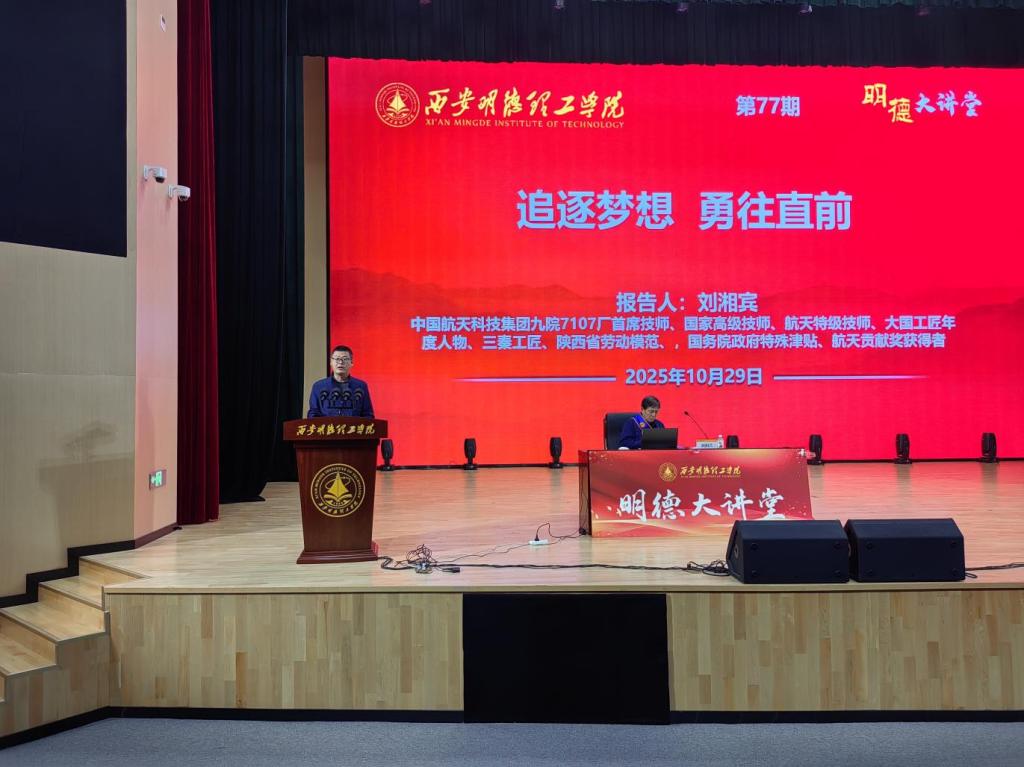 为大力弘扬工匠精神,引导青年学子树立职业理想、坚定奋斗信念,10月29日,beat365特邀中国航天科技集团有限公司第九研究院七一〇七厂首席技师刘湘宾做客“明德大讲堂”,以“追逐梦想 勇往直前”为主题,为1000余名师生带来了一场兼具思想深度与实践温度的专题讲座。讲座由马克思主义学院及通识教育学院党委书记王君涛主持。