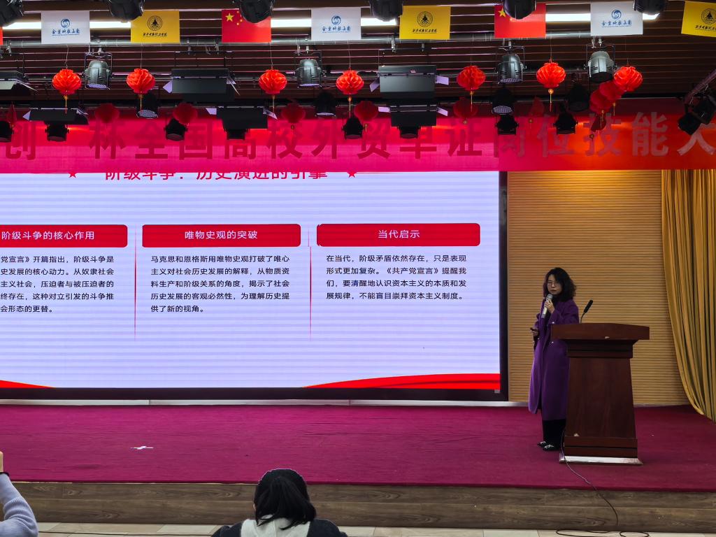 张启云老师以《共产党宣言》这部经典著作为切入点,从著作的写作背景、核心思想与时代价值出发,基于“资产阶级的灭亡和无产阶级的胜利是同样不可避免的”这一核心,进行阶级分析与人类社会发展规律阐释。结合当代中国特色社会主义实践,指出“消灭剥削、消除两极分化、实现共同富裕”的理想社会蓝图对当下发展的指导意义。重点解读了共产党人“为绝大多数人谋利益”的初心使命与“为人类解放而斗争”的历史担当,强调这部著作虽历经百年,其蕴含的马克思主义真理光芒与实践力量仍能为新时代青年指明方向,帮助同学们深刻领会马克思主义的时代价值与现实意义。