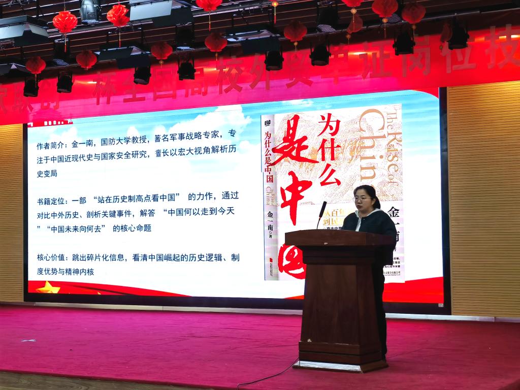 活动伊始,主持人详细介绍了本次读书分享的举办对同学们涵养人文素养、筑牢思想根基的重要意义,并逐一介绍分享嘉宾。分享环节,三位教师分别结合自身研读心得,为经典著作注入鲜活注解。王璐老师以《为什么是中国》为蓝本,从历史脉络与时代语境出发,围绕“精神觉醒、制度适配、战略定力”三大核心维度,深度解读中国发展奇迹背后的深层逻辑。她通过近代中国“被动挨打”的屈辱史与革命年代“精神凝聚”的奋斗史对比,阐明“民族复兴始于精神觉醒”的深刻内涵。以民国政府治理失效与中国共产党领导下的发展成就为参照,结合西方制度与中国特色社会主义的适配性分析,有力论证了党的领导是历史与人民的必然选择,并通过“长征精神”、钱学森等科学家归国报国等鲜活案例,提炼“战略定力”的当代价值,引导同学们认识到个人需以实干尽责立足岗位,国家当以坚定“四个自信”抵御风险,让大家深刻感悟中国道路的历史必然性与制度优越性。