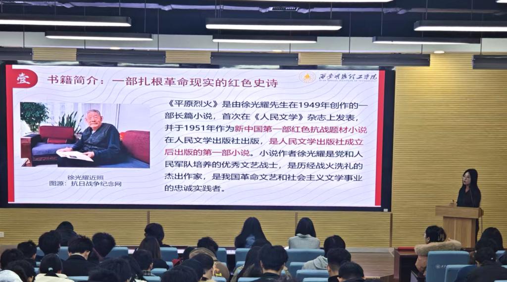 刘梦婷老师聚焦徐光耀先生的《平原烈火》,将视角投向抗战烽火中的英雄群像。该书以1942年冀中“五一大扫荡”为背景,描摹出游击队长周铁汉率残部重建阵地、乡亲们以地道藏伤员、用烟袋锅护战友的动人抗争故事,字里行间满是烽火岁月里的坚守与赤诚。书中英雄们对革命胜利的坚定信仰、军民同心的团结伟力和舍生取义的担当精神深深震撼着现场学子,刘老师结合文本提出,当我们从历史中接过理想的火种,便需将个人理想融入家国发展,以团结凝聚力量,用担当扛起使命,让烽火岁月的精神成为当代青年奋进路上永不熄灭的光。