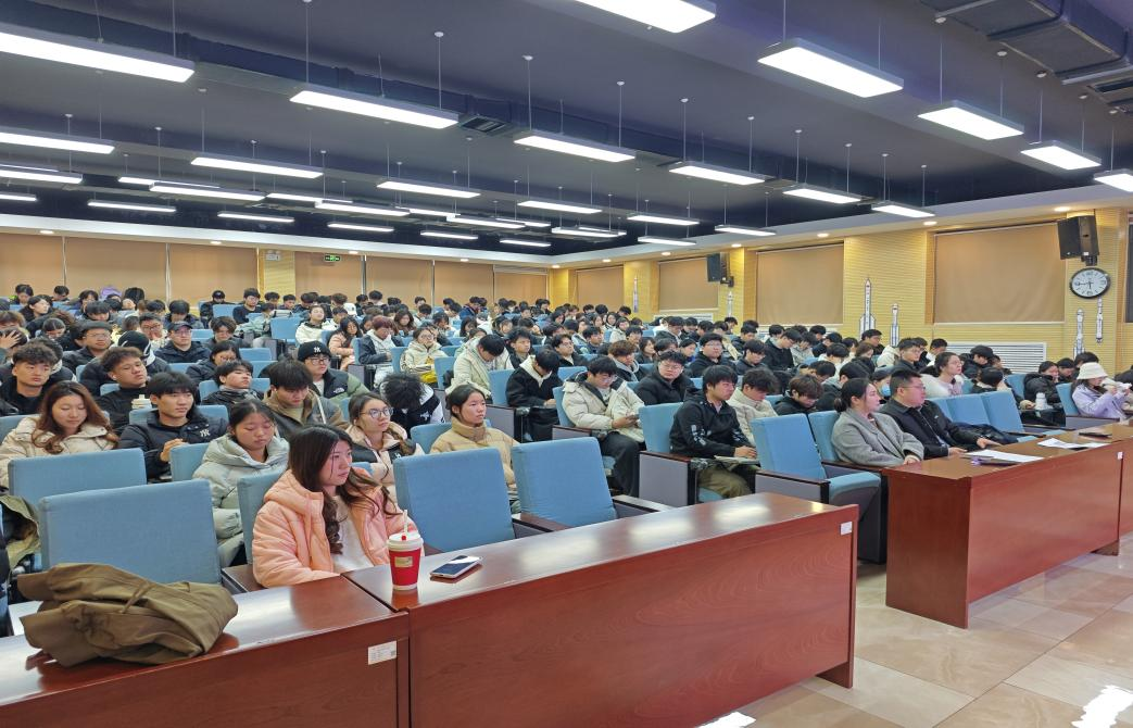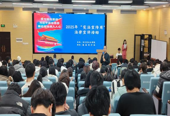 2025年12月4日,时值我国第十二个“国家宪法日”,为深入学习贯彻党的二十大精神和习近平法治思想,积极响应全国“宪法宣传周”活动号召,由马克思主义学院主办、德法同行社、齐越朗诵艺术社协办的“学习宣传贯彻习近平法治思想,推动宪法深入人心”专题法律宣讲活动于中午13:00在建德楼201教室隆重举行。本次活动吸引了200多名学子踊跃参与,现场座无虚席。本场活动由齐越朗诵艺术社姚佳红同学主持。