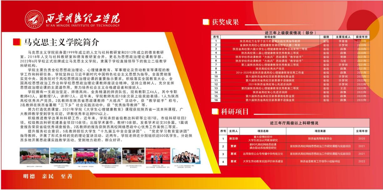 为加强马克思主义学院与通识教育学院教育教学高质量内涵式发展,增进学院教师立德树人的使命感,彰显马克思主义学院底色与通识教育学院特色,持续推动思政课程与课程思政同向同行,马克思主义学院与通识教育学院在明志楼南3楼打造以文化走廊和党员之家建设为重点的铸魂育人新阵地。本次建设项目在校党委的领导和各部门支持下,现已完成建设任务。