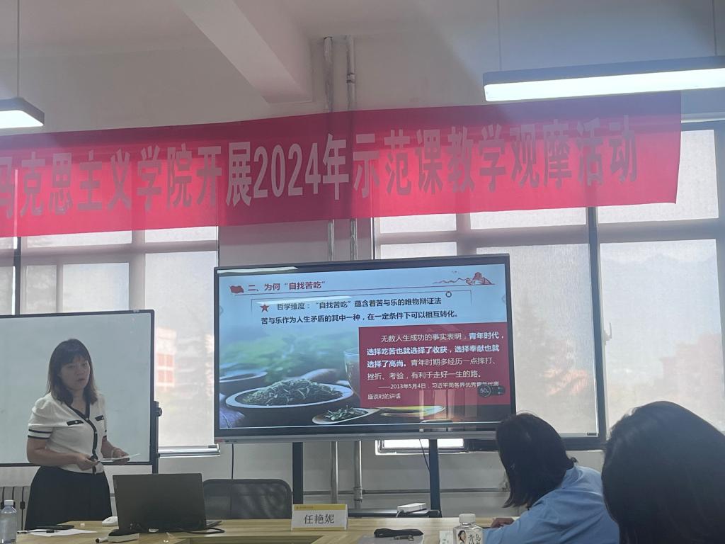 为进一步提高教师的课堂教学水平,促进教师之间的交流与学习,不断提升青年教师教学技能及思政课教育教学质量,2024年9月11日下午,马克思主义学院在明志楼306会议室开展示范课教学观摩活动。此次活动邀请西安财经大学马克思主义学院副院长任艳妮副教授作为嘉宾进行点评,活动由马克思主义学院德育教研室主任樊静主持,《思想道德与法治》课程组全体教师参会。