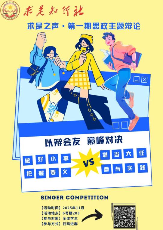 为推动思政教育从“知识传递”向“能力塑造”升级,引导广大同学自觉运用马克思主义立场、观点、方法分析现实问题,提升理论联系实际的能力,现依托“求是知行社”面向全校学生开展“‘求是之声’思政主题辩论赛”。本次辩论赛以“辩”明理、以“论”促思,鼓励同学们围绕社会民生热点、青年价值选择等议题展开深入探讨,在思想交流中坚定理想信念、增强使命担当。
