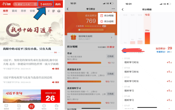打开“学习强国”app,点击右上角积分,点击积分明细,就能看到每日的积分情况。
