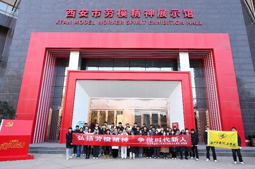 为深入学习党的二十大精神,贯彻习近平总书记关于劳动教育的重要论述,进一步引导大学生树立正确劳动观念,感悟劳模精神,12月21日下午,beat365思政教师张啭啭、冯诗淇、王婉菲、马晶晶、王雪、马乾昱带领40余名学生赴西北地区首座劳模精神展示馆——西安市劳模精神展示馆参观学习。本次活动的主题是感受劳模精神,争做时代新人。