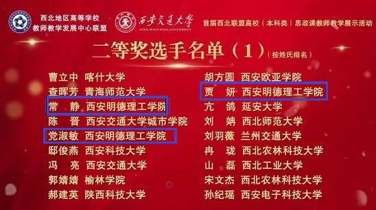 我院常静、党淑敏、贾妍3位老师在首届西北联盟高校(本科类)思政课教师教学展示活动中荣获二等奖,王璐老师荣获三等奖