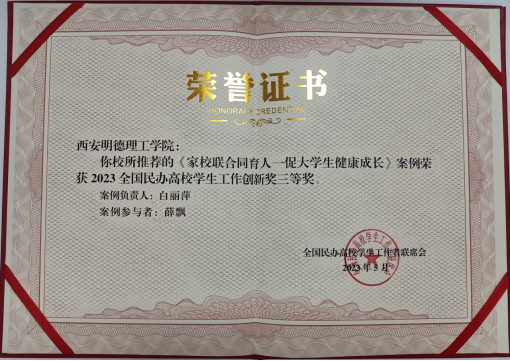 我院心理健康教育教师薛飘参与的案例《家校联合同育人——促大学生健康成长》荣获2023年全国民办高校学生工作创新奖三等奖