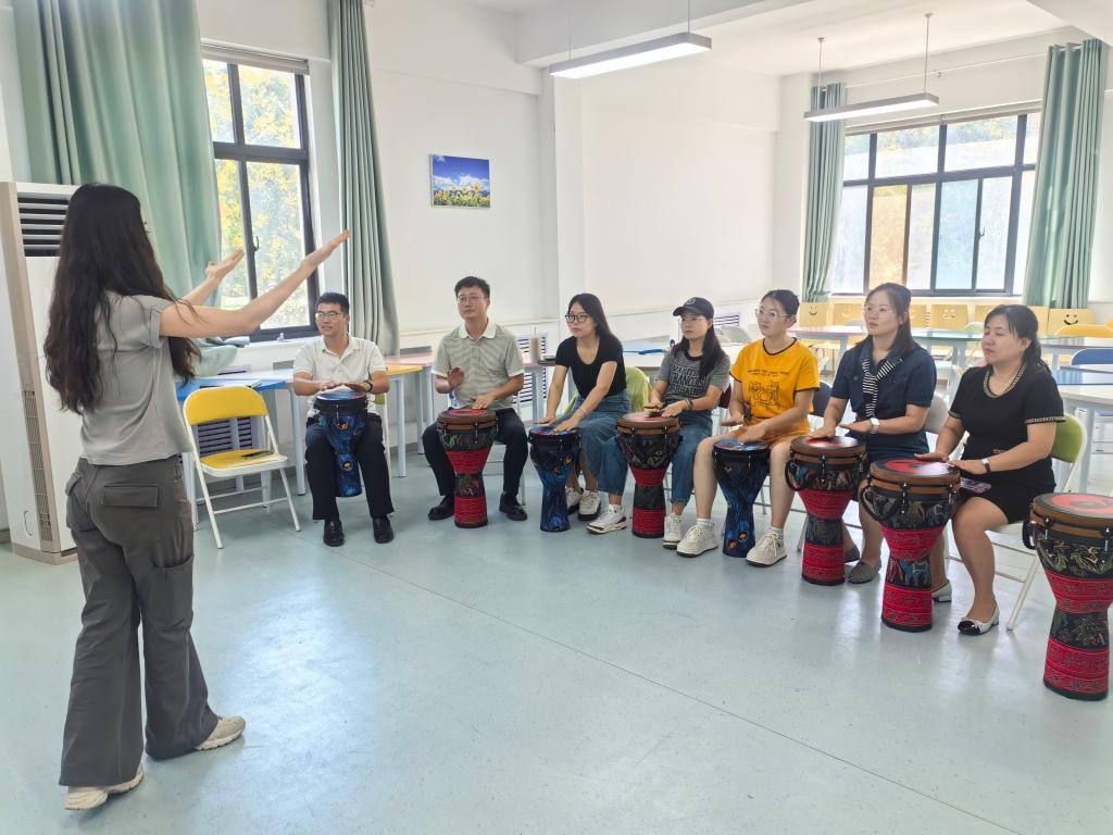 在实操环节,苏老师和郭老师通过现场演示和互动体验,带领老师们逐步掌握鼓圈活动的组织技巧与节奏引导方法。老师们积极参与,在鼓声与节拍中感受非言语沟通的魅力,体验音乐带来的身心整合与情绪流动。活动现场笑声不断,展现了鼓圈文化独特的感染力和互动性。