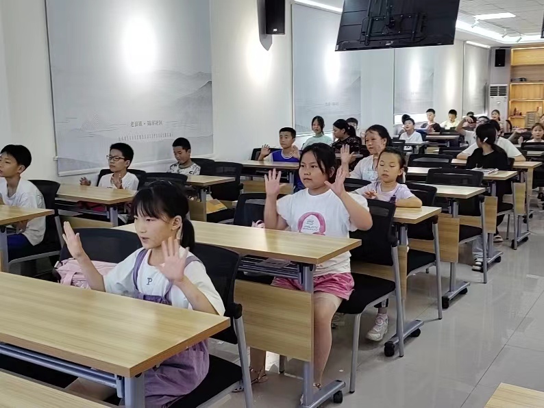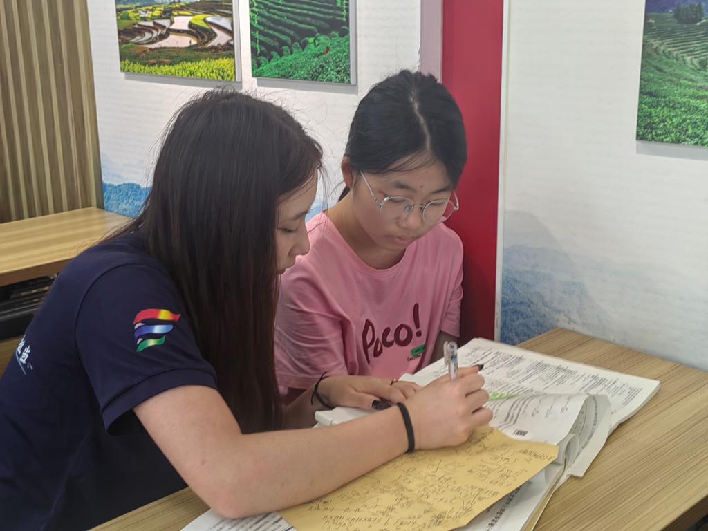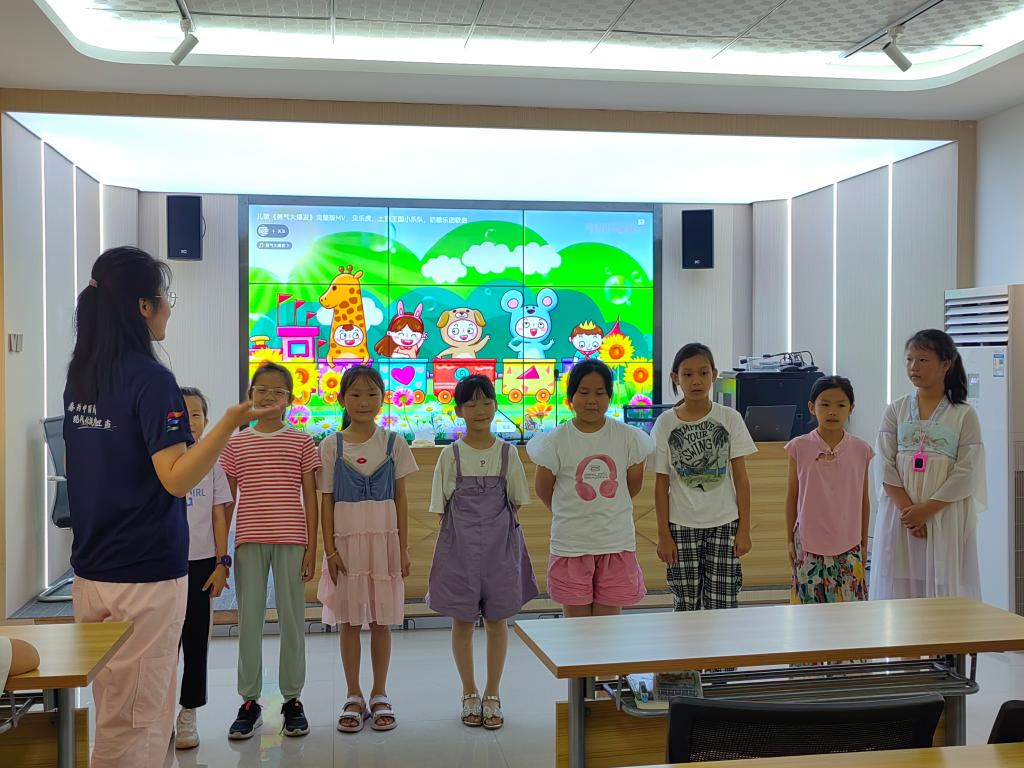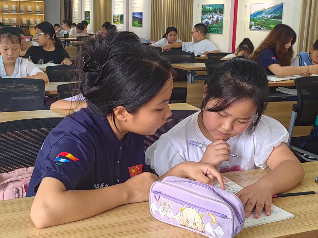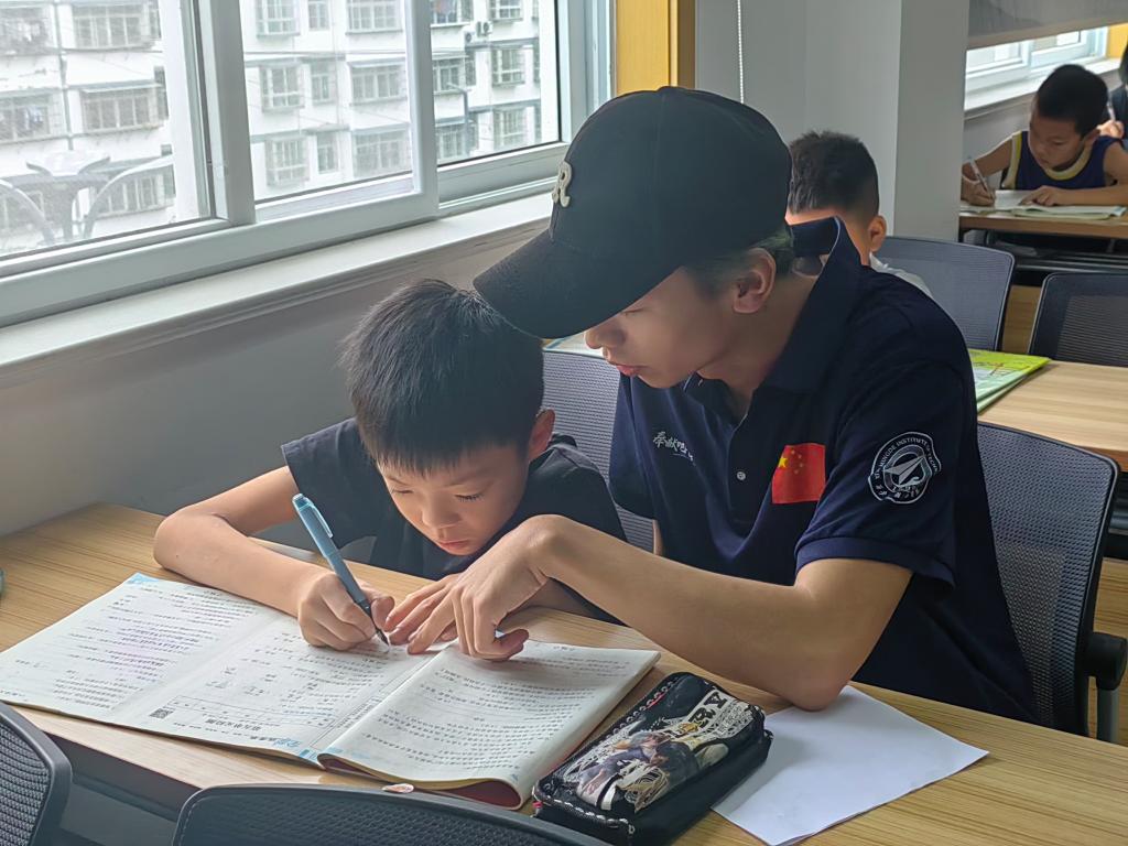 上午队员们对小朋友们的暑假作业进行辅导,中间穿插唱歌、小游戏、拍拍操等多种活动。队员们激情澎湃地讲解,引起小朋友们阵阵掌声,课堂气氛活跃。