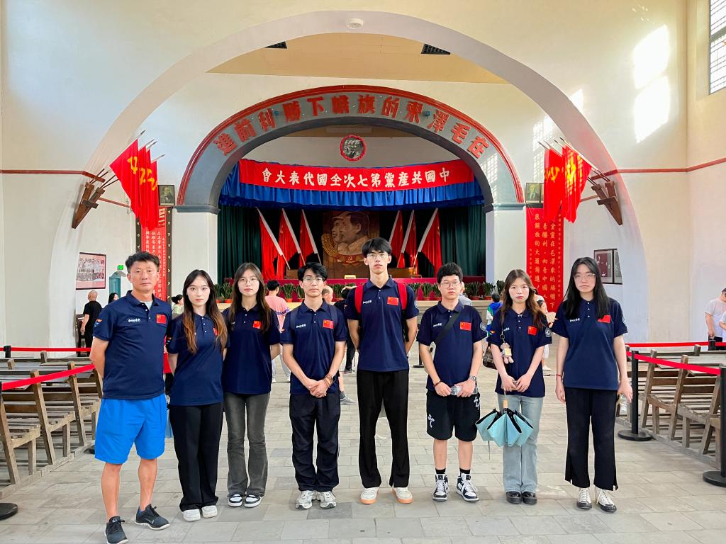 随后,实践队成员们步入中共七大大礼堂,这里曾是中国革命历史的重要转折点。站在这片神圣的土地上,队员们仿佛能听到历史的回响,感受到那份对革命胜利的坚定信念和对未来中国的美好憧憬。中共七大的胜利召开,不仅为中国革命指明了方向,更向世界宣告了中国共产党的成熟与坚强。