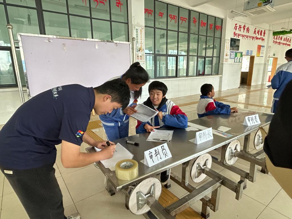 昌都市特殊教育学校较其他学校智力障碍孩子较多,组织模拟法庭具有一定难度,但教师们积极配合,学生们努力表现,最终,一堂有序严谨的模拟法庭课堂顺利进行。通过模拟真实的法庭审判过程,让这群特殊的孩子尽可能的理解法律知识,增强法治观念,培养法律素养。通过角色扮演和亲身体验,孩子们逐渐打开自己,从刚开始的抓耳挠腮,声音极小到大声诵读内容,自信心也得到了提升。丹珍(化名)是一位十几岁的肢体残障同学,从小因为意外烧伤而手指严重受损,在诵读脚本时,她用唯一能够伸直的手指一字一句的指着内容,声音洪亮诵读给大家,让志愿者们感动不已。手语翻译老师泽巴卓嘎眼含热泪的说:我们的孩子多数都是原生家庭造成的各种影响,有的父母认真负责,还会每周来看看或者接走回家,但大多数都是放在这里好几年没人问,假期都是硬要求接回去的。但很多孩子其实很懂事,当然被欺负了也不敢说,这样的法律课堂太必要,增强了孩子们的信心,也拓展了他们的知识,更加明白除了老师,还有法律的保护,感谢志愿者们!扎西德勒!