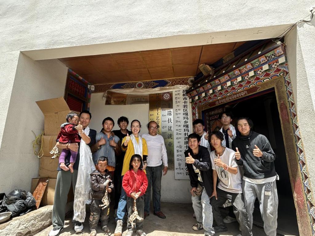 在结束学校各社会实践活动后,志愿者驱车往返近400公里山路来到昌都市卡若区嘎玛乡看望去年毕业的聋哑孩子,了解他们的就业及生活情况。特校2023年毕业来到嘎玛乡嘎玛扎西唐卡绘画有限公司的5位同学,由唐卡大师曲永顿珠亲自教导,日常安排和特殊教育学校时间几乎一致,这里更像是一个唐卡绘画的高级研究中心。毕业生江白多吉带着志愿者们参观整个绘画公司,在40余位画师中最小的只有几岁就来学习唐卡的,也有一大部分都是听力障碍的学生,他们虽然身体有残疾,但却很专注,所以往往一幅作品绘制三四个月时间就可以完成且被订购,一般都在30000到40000售价。毕业生斯朗扎西、布琼次仁、洛松登达等更是热情的邀请志愿者们前往十几公里外山顶上的噶玛寺看他们绘制的墙壁唐卡。据悉噶玛寺已有上千年历史之久,因为年代久远墙壁的画已因为年久失修、自然风化等原因看不清楚了,去年翻修,邀请他们团队绘制墙面,他们也作为优秀画师,顺利完成任务,得到当地政府、僧人、群众的高度肯定。