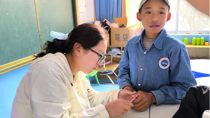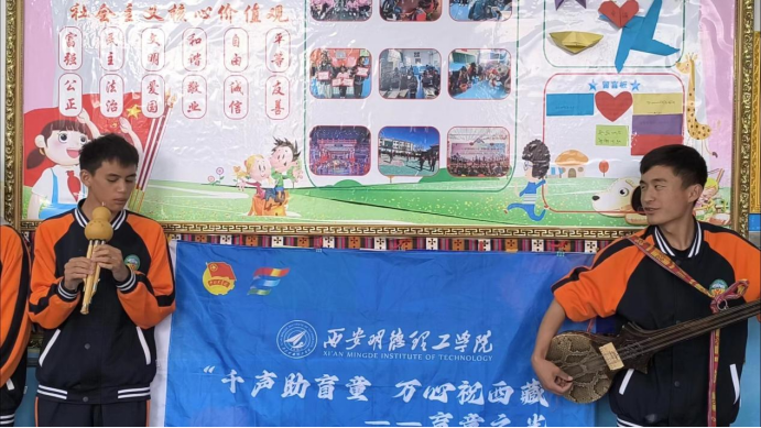 同时,志愿者们与孩子们开展互动音乐疗愈活动。音乐训练能够激活大脑的多个区域,有效促进认知功能的成长。对盲童而言,音乐更是一个强大的工具,帮助他们深化听觉感知,并激发其他感官的潜能,进而提升生活自理能力。孩子们也为志愿者们表演了藏族特有的多种乐器,自信大方的展示自己学习的成果。通过音乐交流,志愿者们也拓宽视野,感受到了民族特色并受到极大鼓舞,志愿者闫海瑞表示:我是一名绘画的艺术生,看到盲童们的表现觉得自己更加应该珍惜健康的身体和可贵的时间,多多学习,多多为社会贡献力量。