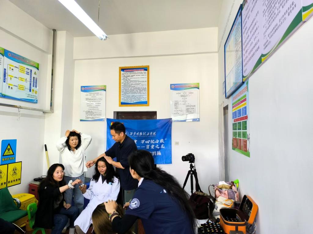 在校医务室中,教师们整齐排座,认真聆听着张梦楚老师为她们讲述植物芳疗与身体按摩减压的相关内容,教师们认真学习到了头疗、手疗、面部刮痧等手法,相互按摩放松,深度减压放松。教师胡燕说:我是内地的老师,作为援藏近20年的老师,深深地感受到身体机能还是受到了影响,通过今天的课堂,让自己学会了简单方式就能放松身心,保证健康,觉得被同事按摩的时候也增进了彼此的感情,非常的收益,期待未来自己也能专业的学习中医或者植物芳疗,为残障学生、自己、自己的家人朋友做更多。