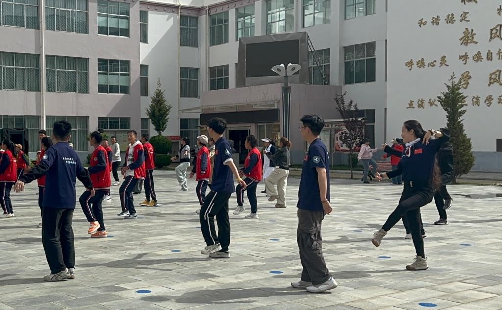 锅庄是藏族的民间舞蹈,在山南市特殊教育学校,每天晚上8:30孩子们都会围在操场上集体载歌载舞,校领导、值班老师都会陪着孩子们一起,欢声笑语间锻炼孩子们的身体,释放老师的压力。志愿者们与孩子们一起跳起来,有的肢体障碍的孩子走路都很困难,却主动给我们教授锅庄,那份自信与民族自豪感油然而生,而我们的志愿者们也认真的学习着,舞动着自己的青春。党委书记扎西陪伴孩子们跳了半个小时后望着孩子们走回宿舍,才放心的对我们说:特校孩子们的精力其实特别好,如果不让他们运动发泄,就很容易在宿舍中出现安全事情,而锅庄具有民族特色,他们又很熟悉,能够自信的舞动,既锻炼了身体,又提升了自信,还发泄了情绪,陪着孩子们每天跳,我们老师身心也很愉悦。今天有志愿者们的加入,我们孩子更开心了,表现得也更加出色。在援藏三十年之际,看到志愿者们第七年来继续坚持这份雪域高原上的志愿事业,很高兴,努力用当代大学生特有的方式在铸牢中华民族共同体意识中贡献自己的力量,多种形式助残,为残疾人献出一份爱心。他表示特别的感谢。